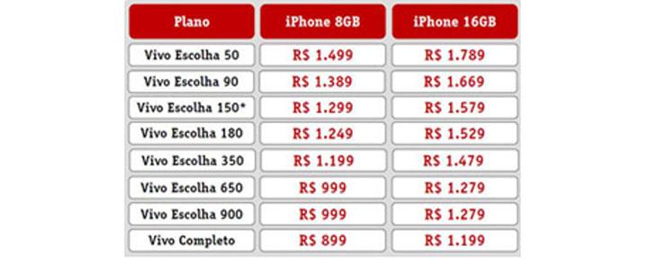 Na Vivo o valor mais baixo do aparelho será para assinantes do plano “Vivo Completo”, que pagarão R$ 525 mensais para ter 1,4 mil minutos de ligações. Para eles o iPhone 3G de 8 GB sairá por R$ 899, e o de 16 GB, por R$ 1.199. O pacote básico “Vivo Escolha 50”, custa R$ 52 para 50 minutos de chamadas por mês e o cliente pagará R$ 1.499 pela versão de 8 GB ou R$ 1.789 pelo modelo de 16 GB.