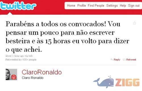Ronaldo estreou segunda-feira no microblog Twitter, como o usuário @ClaroRonaldo. Sem ser convocado para a Copa do Mundo, o “Fenômeno” fechou parceria com a operadora de telefonia Claro fechou para atualizar e comentar os jogos da Copa do Mundo na internet. E já começou a bater forte no técnico da seleção que não o convocou. Além de não gostar da lista de Dunga, o craque postou que “ no primeiro momento preferiria se calar a dizer o que não deve”.