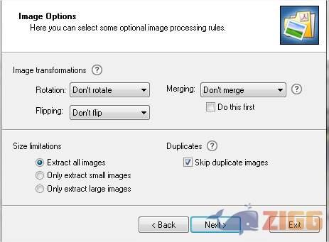 Passo 6: Como alternativa, o usuário pode realizar algumas pequenas modificações nas imagens. No campo Image Options é possível rotacionar, inverter ou mesclar diferentes imagens. Em Size Limitations, pode-se definir o tamanho das imagens a serem extraídas. Enquanto na caixa Skip duplicate imagens você exclui imagens replicadas.