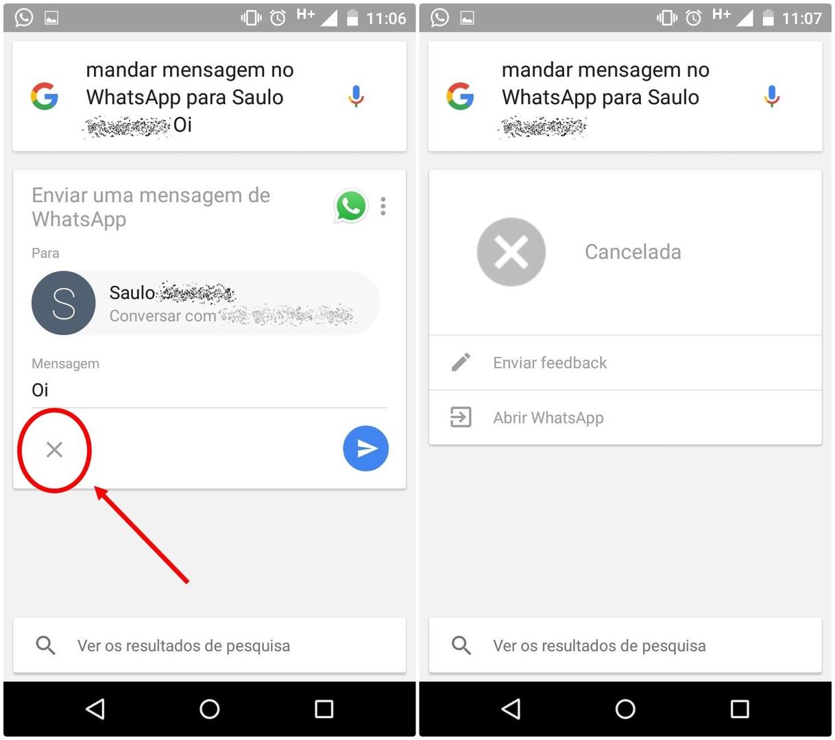 Se você não tocar no “X” para cancelar, a mensagem será enviada automaticamente após alguns segundos. Esse comando é bem útil se você estiver com as mãos ocupadas dirigindo, ou quando as mãos estiverem molhadas ou meladas (com comida, por exemplo). Você pode acionar o comando e enviar a mensagem somente através de comandos de voz, sem precisar usar as mãos. Este comando é útil ainda no caso de telefones de bolso ou ainda quando o telefone está conectado a um microfone via Bluetooth. Fácil, não é?
