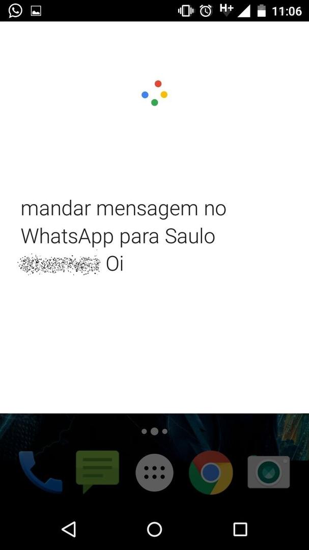 Passo 2. Agora, para você iniciar uma conversa por mensagens de texto no WhatsApp, deve falar o comando “mandar mensagem no WhatsApp para fulano”, e logo em seguida você fala a mensagem (no caso do exemplo da figura abaixo, a mensagem foi “oi”). O comando vale tanto se você iniciou o processo pelo botão de reconhecimento de voz ou se iniciou pelo “Ok Google”.