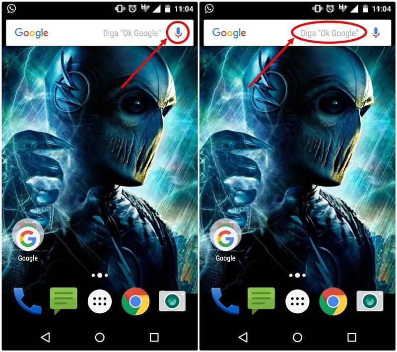 Passo 1. Em sua tela inicial, ative a função do reconhecimento de voz, que fica do lado direito da barra de pesquisa do Google. Ou você pode acionar essa mesma função simplesmente falando “Ok Google”.