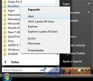 2. Depois disso, vá em Iniciar ~> Todos os Programas, clique com o botão direito em cima da pasta “Inicializar” e selecione “Abrir”.