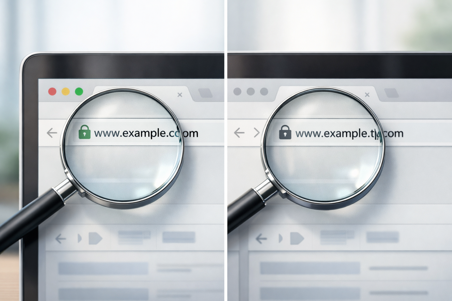 Leia o domínio principal letra por letra. Desconfie de letras trocadas, números no lugar de caracteres, palavras extras, hífens fora do padrão e finais de domínio que não combinam com a marca oficial.