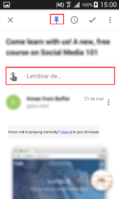 Você pode marcar e-mails para acompanhá-los com mais facilidade. Para isso, abra o e-mail, tocando nele, e selecione o “pin” (o ícone do alfinete ao lado do relógio). Surgirá também uma área onde você pode inserir um comentário, para ajudar a lembrá-lo de algo relacionado à mensagem.