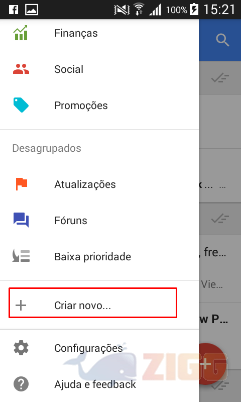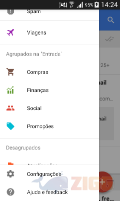 Grupos que possuem novas mensagens aparecem no topo da caixa de entrada em “faixas”. Basta tocar na “faixa” para mostrar os e-mails novos do grupo. Para ver todas as mensagens de um grupo, mesmo as mais antigas, basta deslizar a tela da esquerda para a direita ou clicar no botão com três linhas horizontais, no canto superior esquerdo, e tocar no nome do grupo desejado.