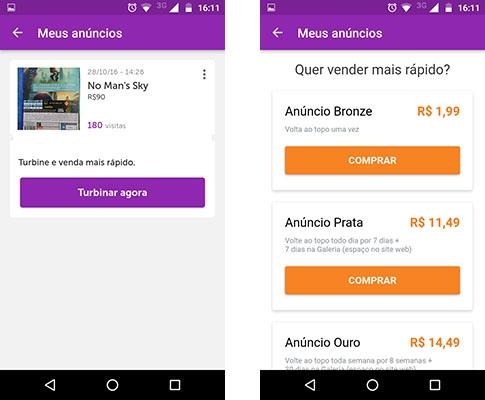 Há três tipos de impulsionamento. Em ambos, o seu anúncio volta ao topo da tela inicial. Quanto maior o plano, mais vezes o anúncio retorna à tela inicial, aumentando as chances de seu produto ser vendido.
