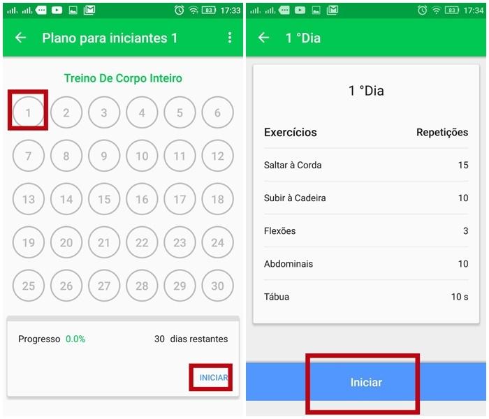 Quando você escolher qual plano vai iniciar, aparecerá um nova tela no seu smartphone com 30 bolinhas numeradas, você pode clicar na bolinha de número “1” ou em “Iniciar” para começar a registrar seu progresso.